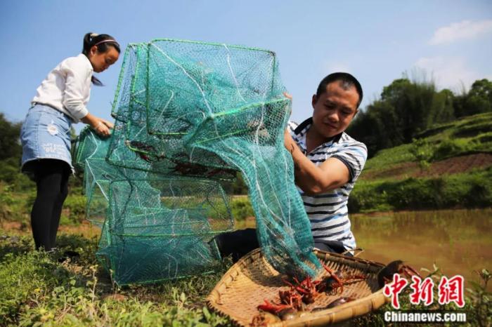 2017年4月29日,四川省泸州市叙永县,邵泽刚和家人收获稻田养殖的“小龙虾”。邵泽刚利用黑水虻养殖鸡、小龙虾、黄鳝、田螺等,形成“猪—鸡—虾”的立体养殖模式。中新社发 刘传福 摄