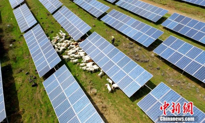 2017年3月28日,当地村民在江苏省盱眙县天泉湖镇光伏发电站内放羊。近年来,江苏省淮安市盱眙县天泉湖镇向荒山要效益,发展畜牧业和光伏互补的光伏发电项目。 中新社发 颜怀峰 摄