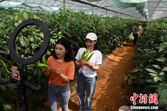 2021年5月16日,江西省赣州市安远县鹤子镇阳佳村文明实践员郭燕婷(左)与巾帼志愿服务队队长郭冬秀在富硒产业基地直播茄子、辣椒等富硒蔬菜。中新社记者 毛建军 摄