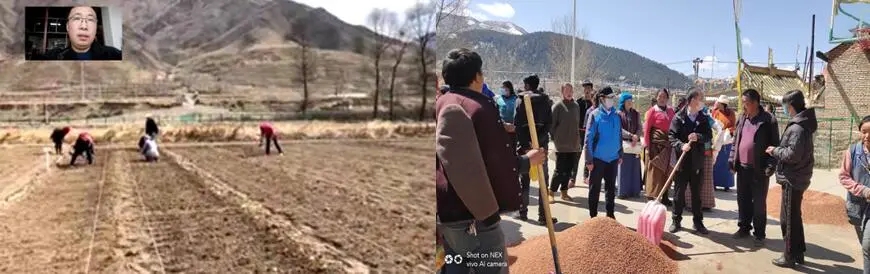 深入农户地头,完善技术方案。项目实施期间,帮扶团队带头人赵飞博士多次赶赴一线,实地考察田间青稞的长势情况。根据实验示范数据,赵飞博士与当地技术人员深入探讨、不断完善和修正技术方案,最终确定按照统一品种、统一连片种植、统一机耕机播、统一灌水、统一施肥、统一病虫草害防治、统一收获、统一贮运“八个统一”的原则开展青稞新技术示范生产推广。