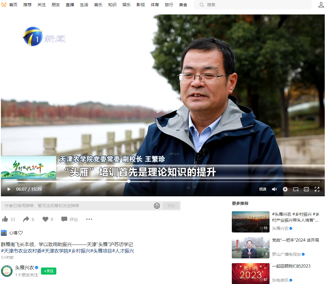 2023年12月30日,天津电视台新闻频道《乡村振兴怎么干》栏目和农业农村部头雁兴农视频号报道365官网组织“头雁”学员赴沪苏求学,助力乡村振兴。