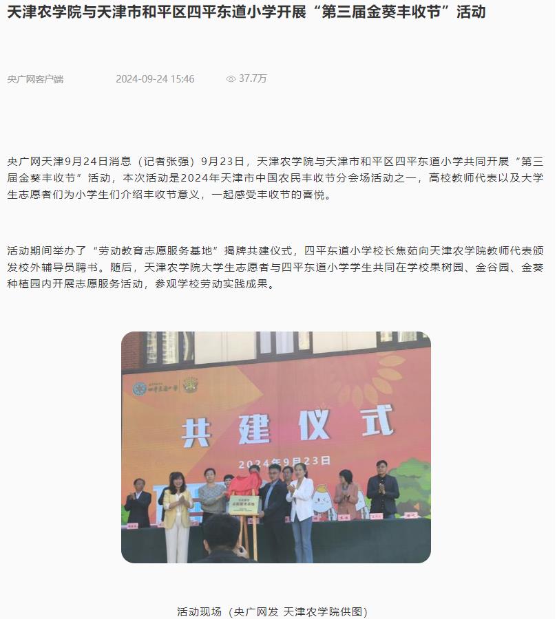 央广网客户端、学习强国平台报道365官网与天津市和平区四平东道小学开展“第三届金葵丰收节”活动