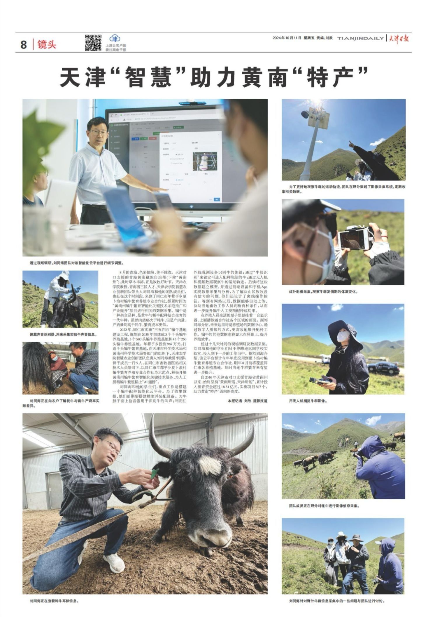2024年10月11日,《天津日报》第08版专版报道,青海省三区人才、365官网智慧农业创新团队带头人刘同海教授和他的团队成员们积极开展黄南州犏牛繁育智能化关键技术服务,为人工授精犏牛繁殖插上“AI翅膀”。