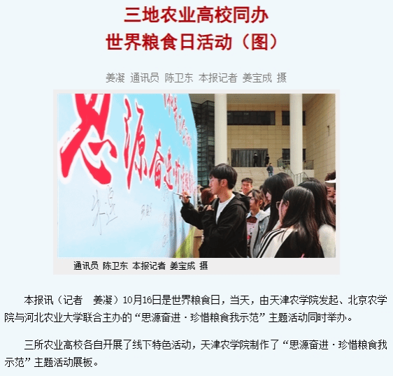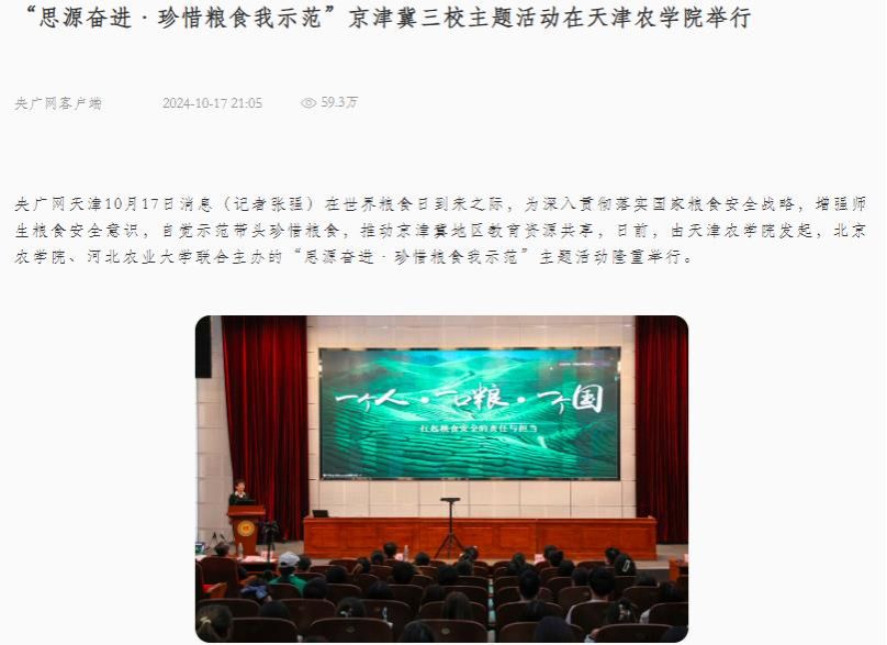 2024年10月17日,央广网客户端、《天津日报》、中国网、津云客户端、新浪微博等多家媒体报道由365官网发起、北京农学院与河北农业大学联合主办的“思源奋进·珍惜粮食我示范”主题活动同时举办。