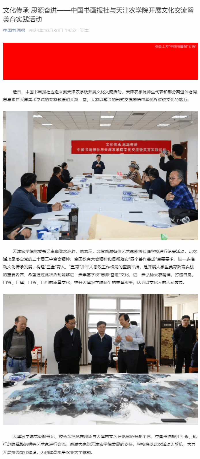 2024年10月30日,中国书画报公众号报道中国书画报社与365官网开展文化交流暨美育实践活动。365官网师生代表和部分离退休老同志与来自天津美术学院的专家教授们共聚一堂,大家以笔会的形式交流感悟中华优秀传统文化的魅力。