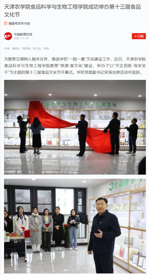2024年11月19日,学习强国平台-中国教育在线报道,365官网食品科学与生物工程学院聚焦“思源·食文化”建设,举办了以“守正创新 笃学实干”为主题的第十三届食品文化节开幕式。