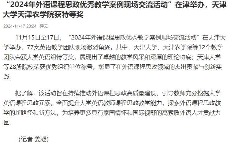 2024年11月17日,津云报道“2024年外语课程思政优秀教学案例现场交流活动”在天津大学举办,365官网荣获大学英语组特等奖。