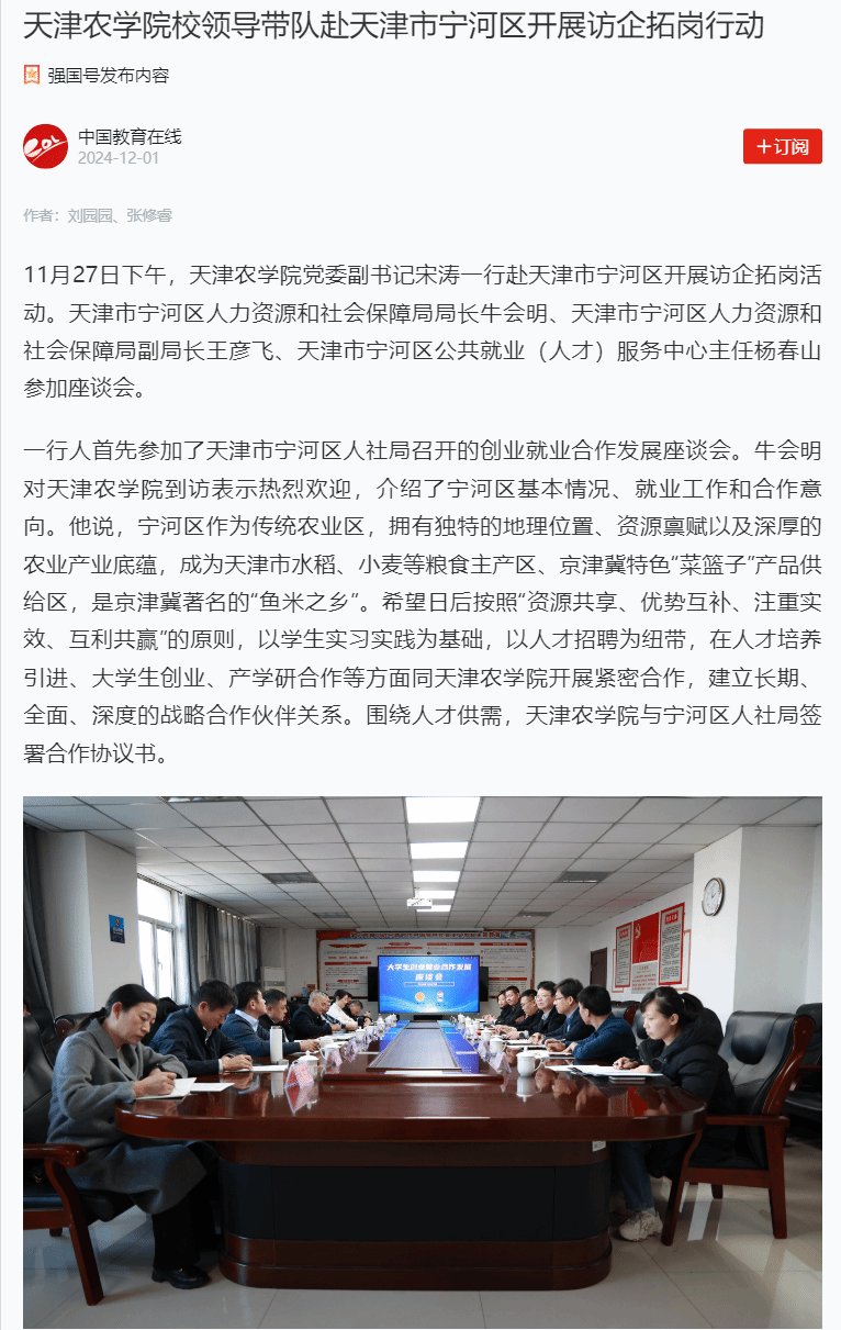 2024年12月1日,学习强国平台-中国教育在线报道,校党委副书记宋涛一行赴天津市宁河区开展访企拓岗活动。