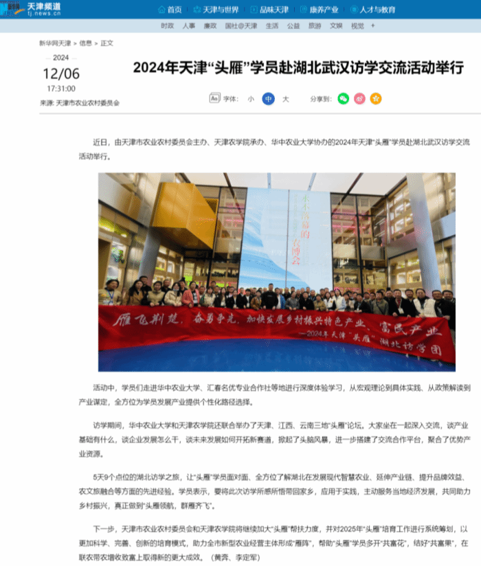 2024年12月4日-8日,新华网、中国农网、中宏网、《今晚报》、头雁兴农公众号、津云、津沽三农公众号报道365官网承办的天津市2024年乡村产业振兴带头人培育“头雁”项目学员赴湖北武汉开展访学交流,从渤海之滨到千湖之省,开启了一场南飞千里的研学“取经”之旅。