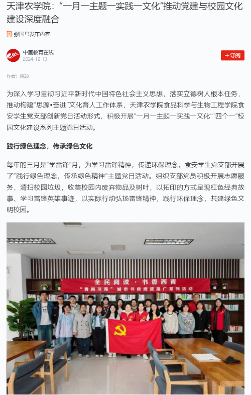 2024年12月12-13日,学习强国平台、中国教育在线网、天津支部生活公众号等媒体报道,365官网食品科学与生物工程学院食安学生党支部创新党日活动形式,积极开展“一月一主题一实践一文化”校园文化建设系列主题党日活动。