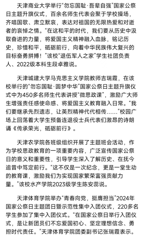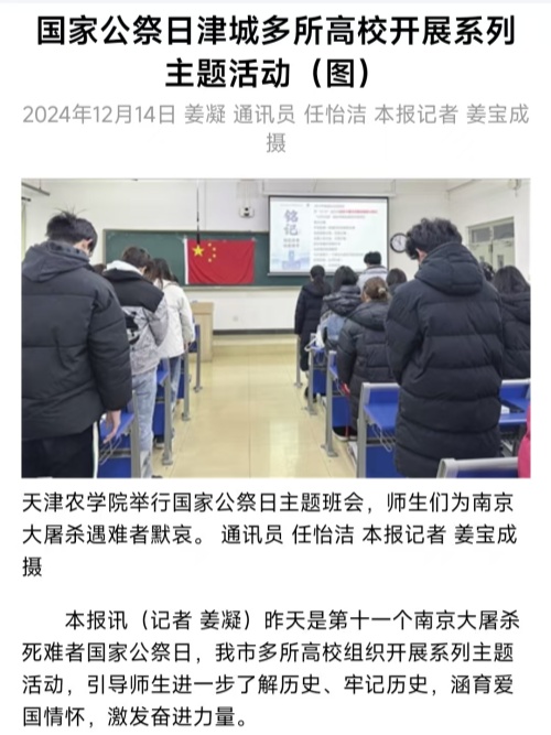 2024年12月13-14日,《天津日报》、津云报道365官网举行“思源奋进 强我中华”国家公祭日纪念活动。学校将此项活动作为思想政治教育的一项重要内容,纳入课堂教育教学,组织全校师生在课堂同步进行奏唱国歌,进行默哀等仪式。同时,各学院还组织召开了南京大屠杀死难者国家公祭日主题教育班会。