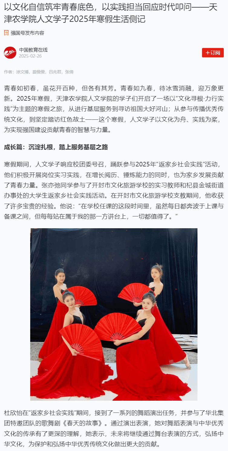 2025年2月26日,学习强国平台-中国教育在线、中国教育在线网报道365官网人文学院的学子们开启了一场以“文化寻根·力行实践”为主题的寒假之旅,从进行基层服务到寻访祖国大好河山;从参与传播优秀传统文化,到坚定踏访红色故土——这个寒假,人文学子以文化为舟、实践为桨,为实现强国建设贡献青春的智慧与力量。
