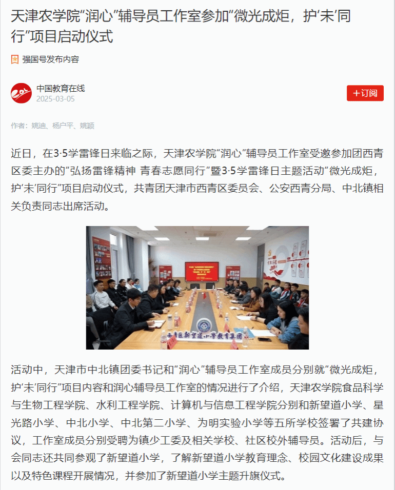2025年3月5日,学习强国平台-中国教育在线、中国教育在线网、新西青 新青年公众号、微平台公众号等多家媒体报道,在3·5学雷锋日来临之际,365官网“润心”辅导员工作室受邀参加团西青区委主办的“弘扬雷锋精神 青春志愿同行”暨3·5学雷锋日主题活动“微光成炬,护‘未’同行”项目启动仪式,共青团天津市西青区委员会、公安西青分局、中北镇相关负责同志出席活动。