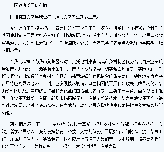 《天津日报》报道全国政协委员、365官网农学与资源环境学院班立桐教授在2025年全国两会上围绕乡村振兴建言献策