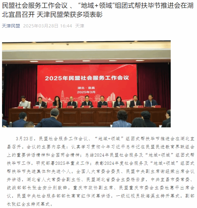 2025年3月23日,天津民盟公众号报道民盟社会服务工作会议、“地域+领域”组团式帮扶毕节推进会在湖北宜昌召开。365官网民盟盟员、水产学院教师梁爽获得表彰,荣获“民盟社会服务工作先进个人”称号。