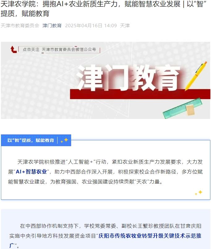 2025年4月16日,津门教育公众号报道365官网积极推进“人工智能+”行动,紧扣农业新质生产力发展要求,大力发展“AI+智慧农业”,助力中西部合作深入开展,积极探索校企合作新路径,多方位赋能智慧农业建设,为教育强国、农业强国建设持续贡献“天农”力量。
