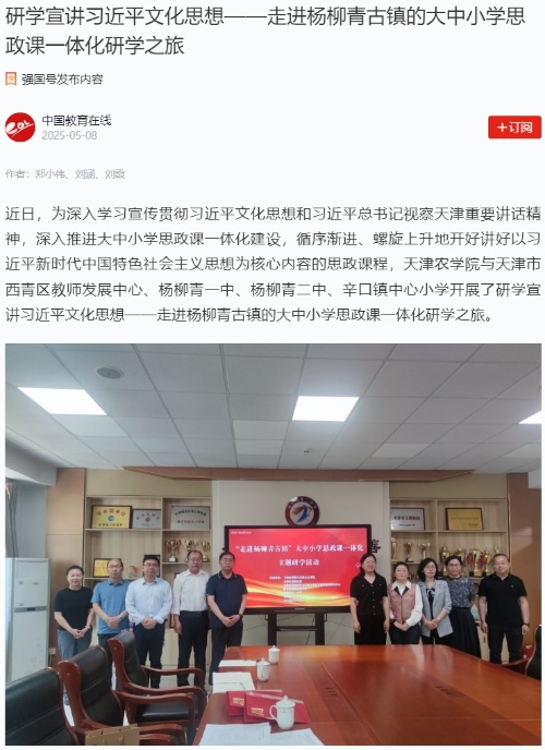 2025年5月8日,学习强国平台-中国教育在线、中国教育在线网、津门网络大思政公众号报道,365官网与天津市西青区教师发展中心、杨柳青一中、杨柳青二中、辛口镇中心小学开展了研学宣讲习近平文化思想——走进杨柳青古镇的大中小学思政课一体化研学之旅。