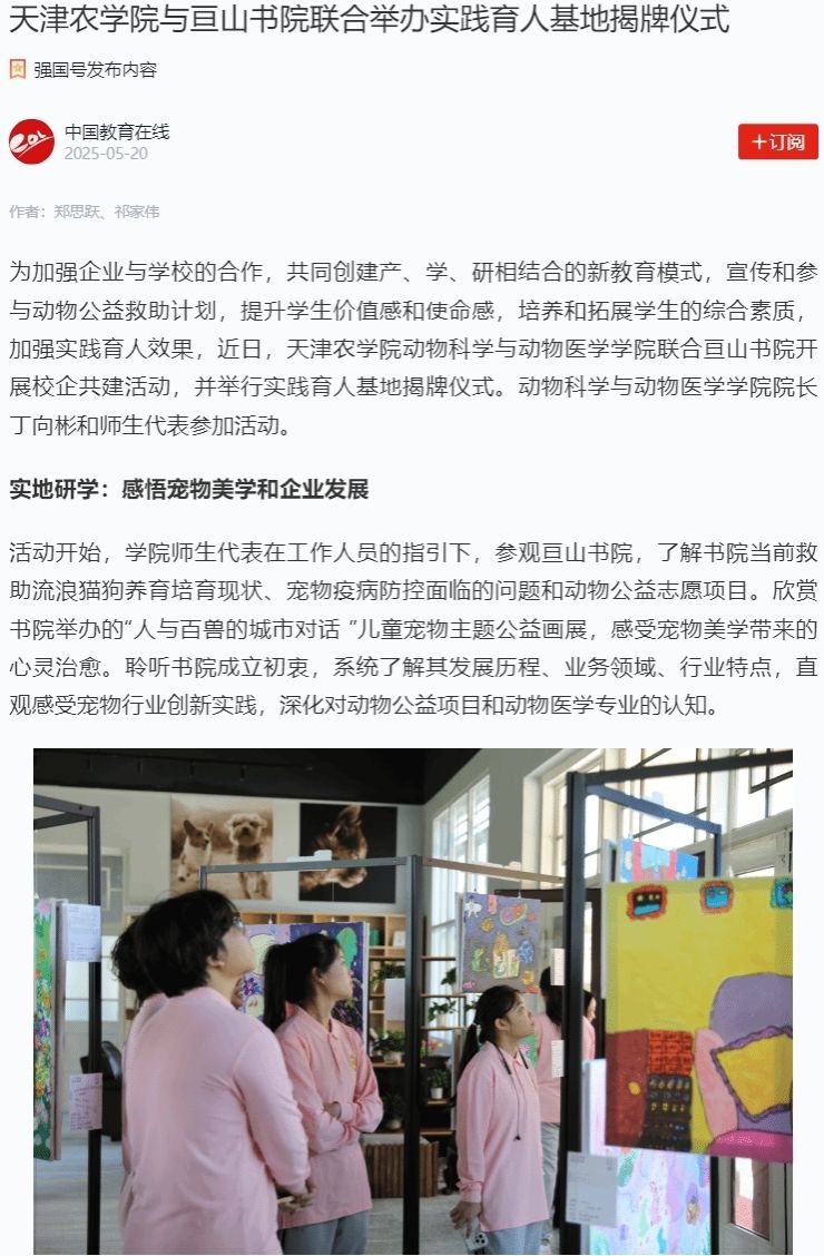 2025年5月20日,学习强国平台-中国教育在线、中国教育在线网报道,365官网动物科学与动物医学学院联合亘山书院开展校企共建活动,并举行实践育人基地揭牌仪式。