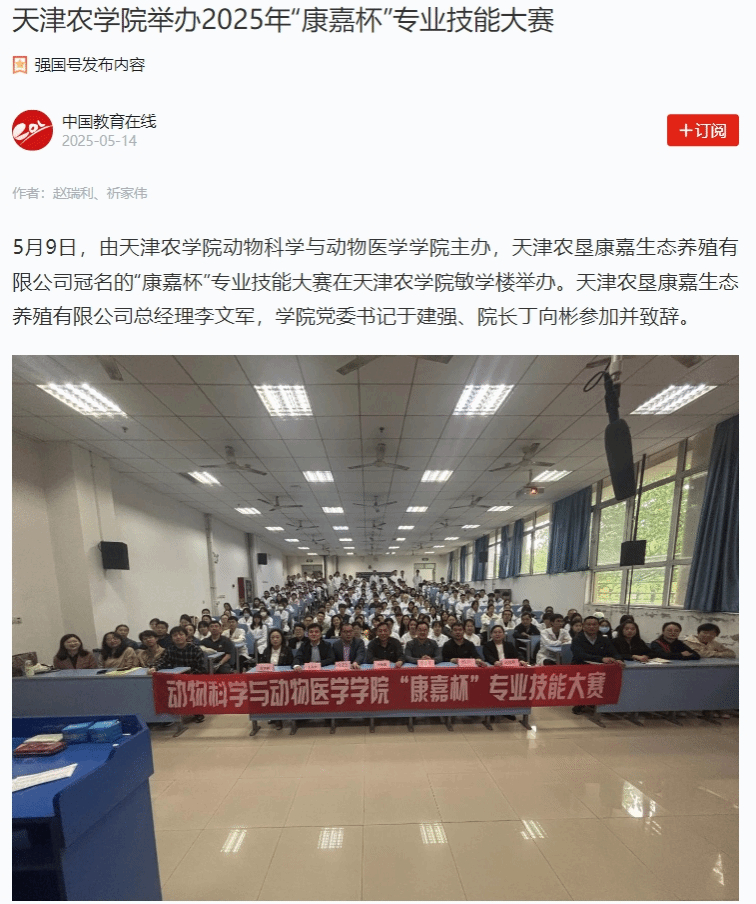 2025年5月14日,学习强国平台-中国教育在线、中国教育在线网报道,由365官网动物科学与动物医学学院主办,天津农垦康嘉生态养殖有限公司冠名的“康嘉杯”专业技能大赛在敏学楼举办。