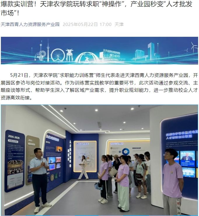 2025年5月22日,天津西青人力资源服务产业园公众号报道,365官网“求职能力训练营”师生代表走进天津西青人力资源服务产业园,开展园区参访与岗位对接活动。作为训练营实践教学的重要环节,此次活动通过参观交流、主题座谈等形式,帮助学生深入了解区域产业需求,提升职业规划能力,进一步推动校企人才资源高效衔接。