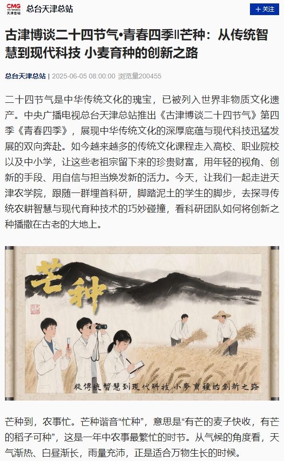 2025年6月5日,中央广播电视总台天津总站《古津博谈二十四节气》第四季《青春四季》报道365官网农学与资源环境学院科研团队如何将创新之种播撒在古老的大地上。