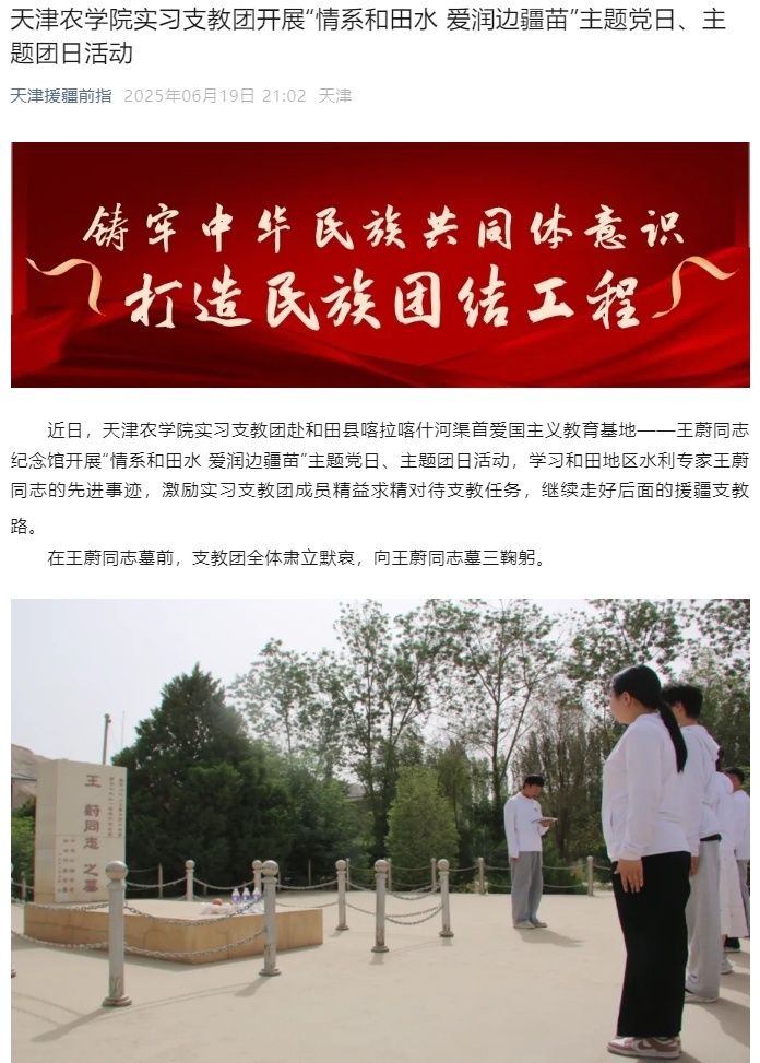 2023年6月19日,天津援疆前指公众号报道365官网实习支教团赴和田县喀拉喀什河渠首爱国主义教育基地——王蔚同志纪念馆开展“情系和田水 爱润边疆苗”主题党日、主题团日活动,学习和田地区水利专家王蔚同志的先进事迹,激励实习支教团成员精益求精对待支教任务,继续走好后面的援疆支教路。