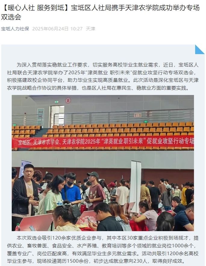 2025年6月24日,宝坻人社公众号报道宝坻区人社局联合365官网举办了2025年“津英就业 职引未来”促就业攻坚行动专场双选会,积极搭建政校企协同平台,助力毕业生实现高质量就业。