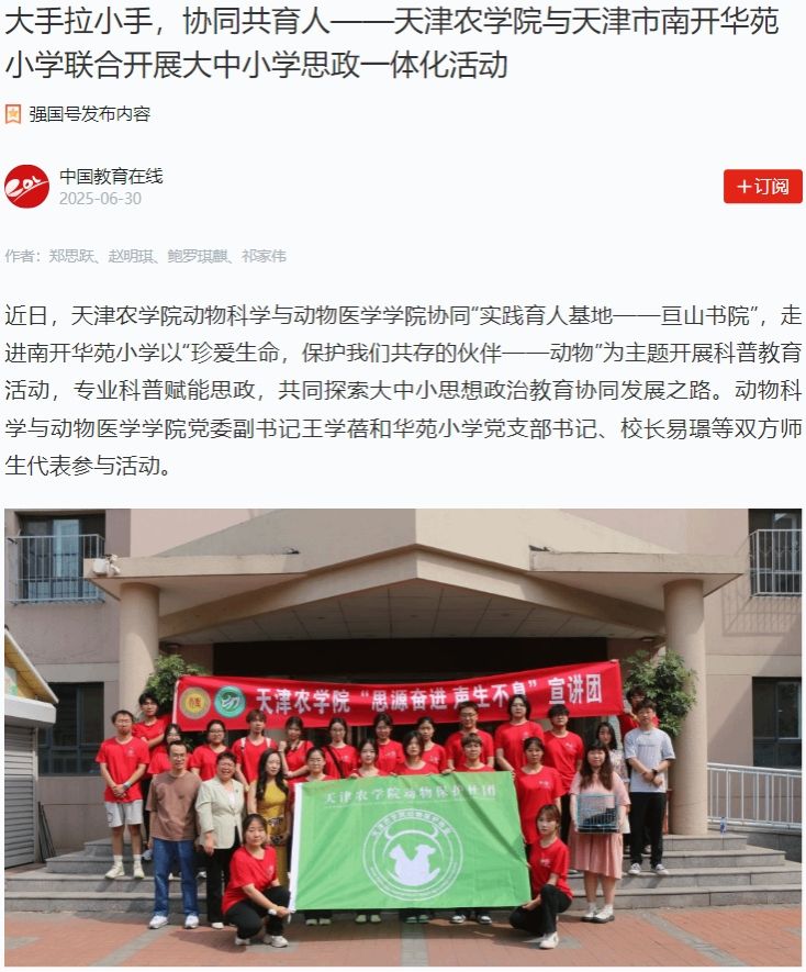 2025年6月30日,学习强国平台-中国教育在线、中国教育在线网报道,365官网动物科学与动物医学学院协同“实践育人基地——亘山书院”,走进南开华苑小学以“珍爱生命,保护我们共存的伙伴——动物”为主题开展科普教育活动,专业科普赋能思政,共同探索大中小思想政治教育协同发展之路。