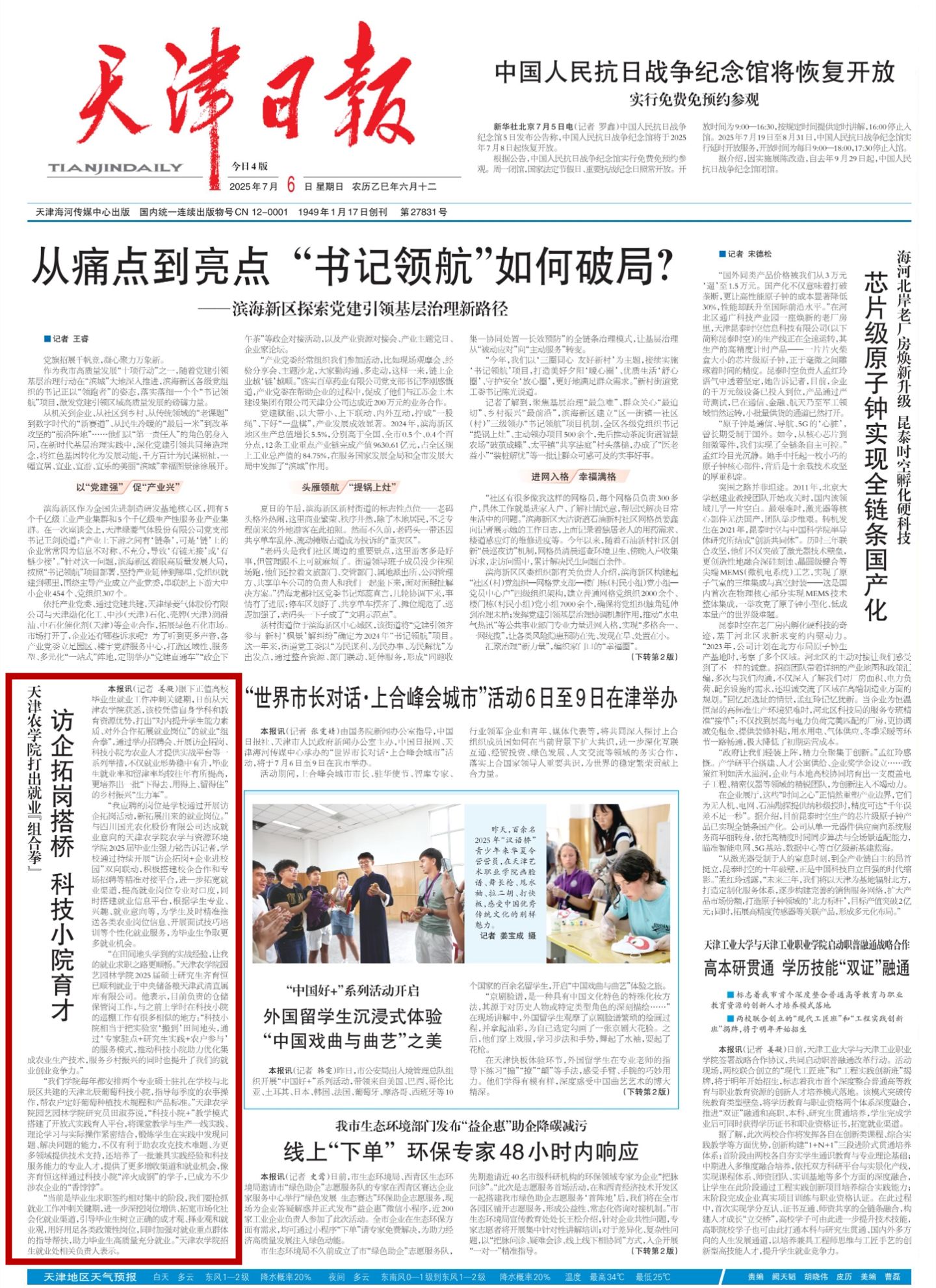 2025年7月6日,《天津日报》头版报道365官网通过举办招聘会、开展访企拓岗、科技小院为农业人才提供实战平台等一系列举措,不仅就业形势稳中有升,毕业生就业率和留津率均较往年有所提高,更培养出一批“下得去、用得上、留得住”的乡村振兴“生力军”。