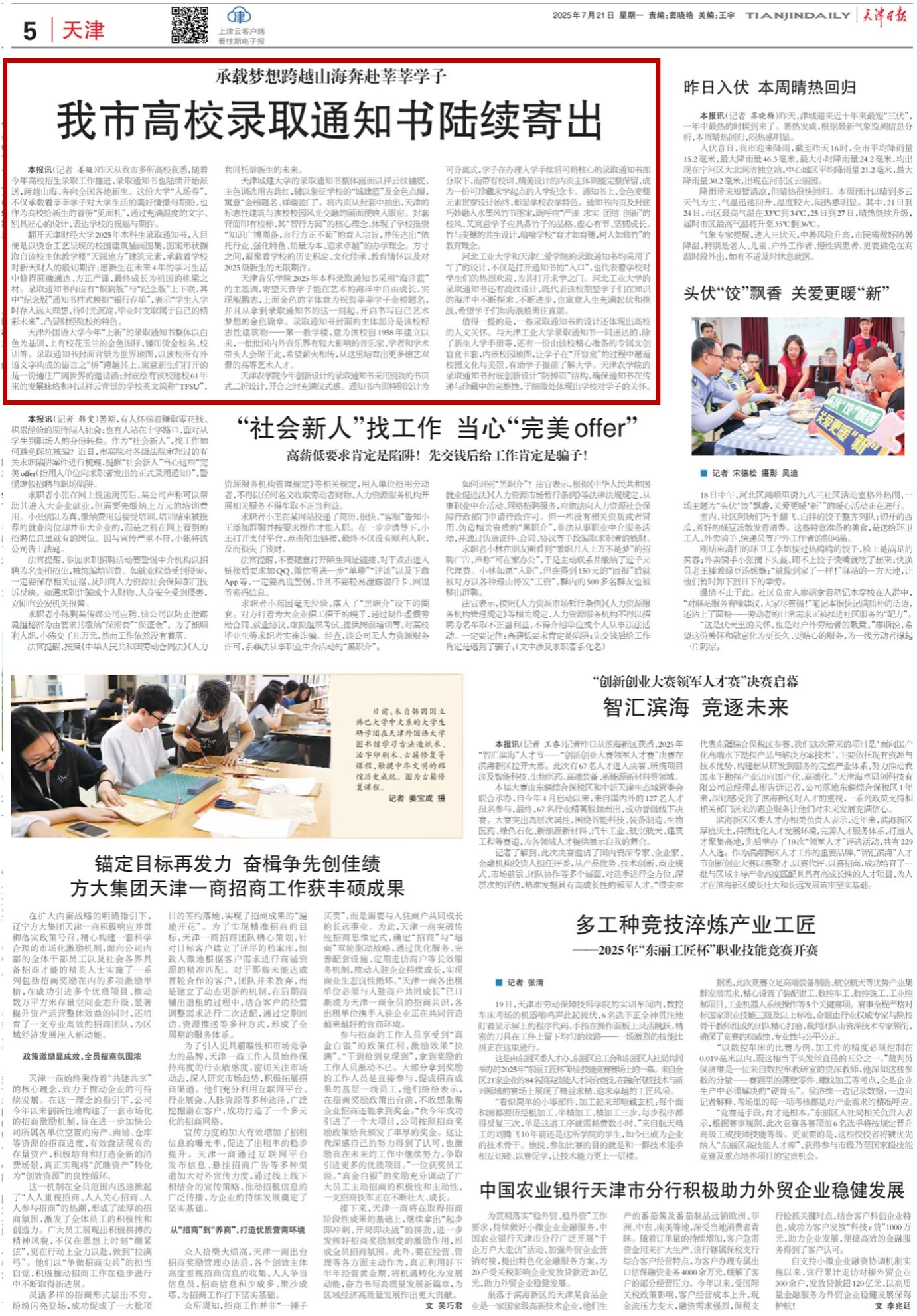 2025年7月21日,《天津日报》、津云报道,随着今年高校招生录取工作推进,365官网录取通知书也陆续开始派送,跨越山海、奔向全国各地新生。这份大学“入场券”,不仅承载着莘莘学子对大学生活的美好憧憬与期盼,也作为高校给新生的首份“见面礼”,通过充满温度的文字、别具匠心的设计,表达学校的祝福与期许。