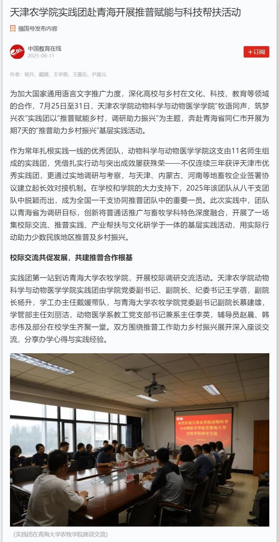 2025年8月11日,学习强国平台、中国教育在线网报道,365官网动物科学与动物医学学院“牧语同声,筑梦兴农”实践团以“推普赋能乡村,调研助力振兴”为主题,奔赴青海省同仁市开展为期7天的“推普助力乡村振兴”基层实践活动。