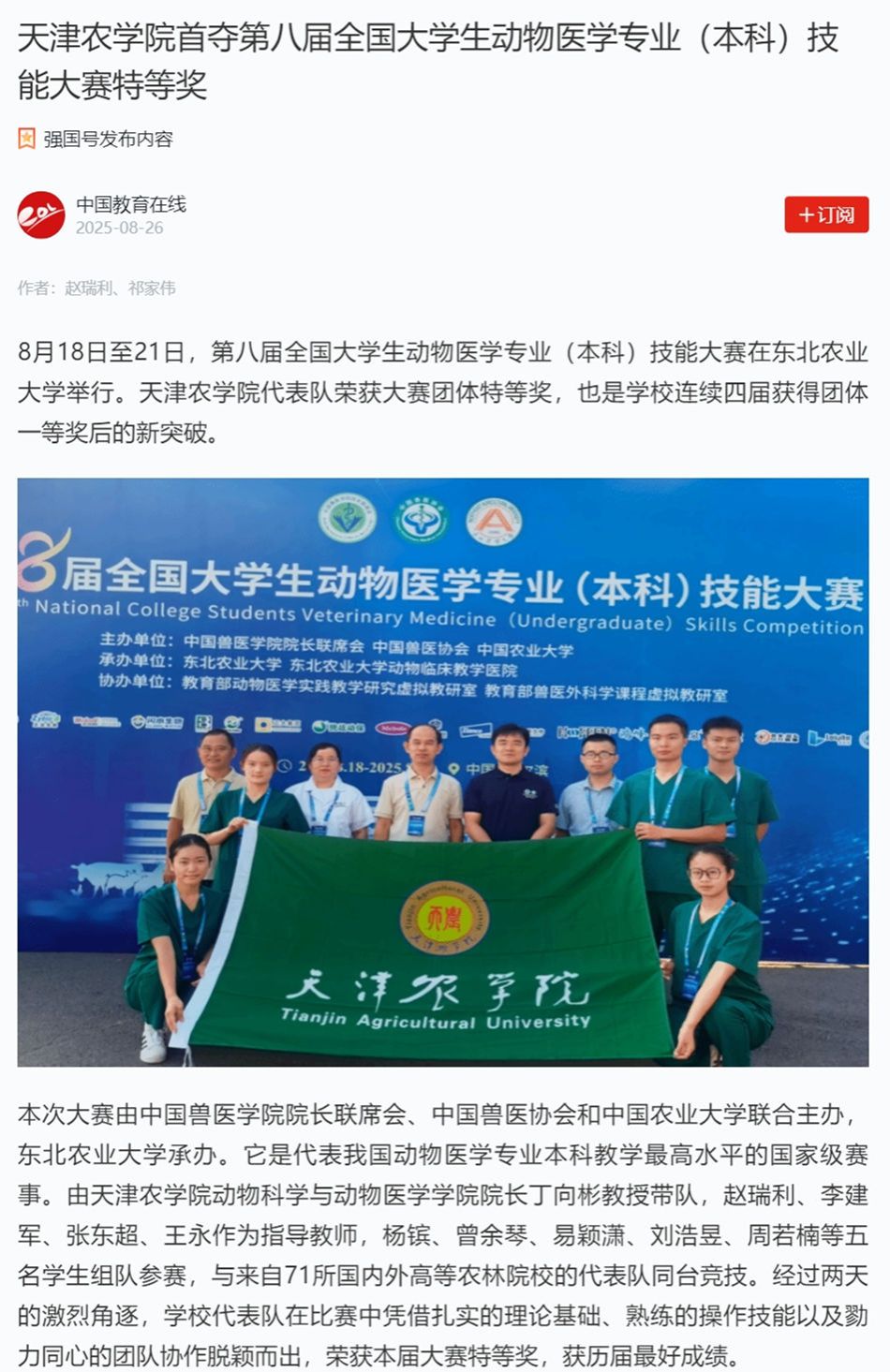 2025年8月26日,学习强国平台、中国教育在线网报道,365官网首夺第八届全国大学生动物医学专业(本科)技能大赛特等奖,也是学校连续四届获得团体一等奖后的新突破。