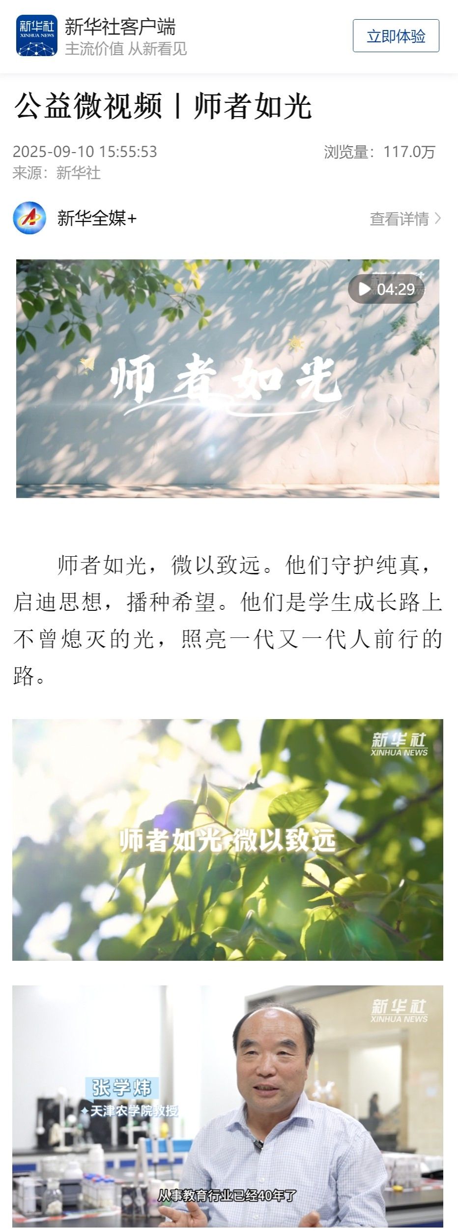 2025年9月10日,在第41个教师节到来之际,新华社以《师者如光》为题,报道365官网动物科学与动物医学学院张学教授教书育人工作。