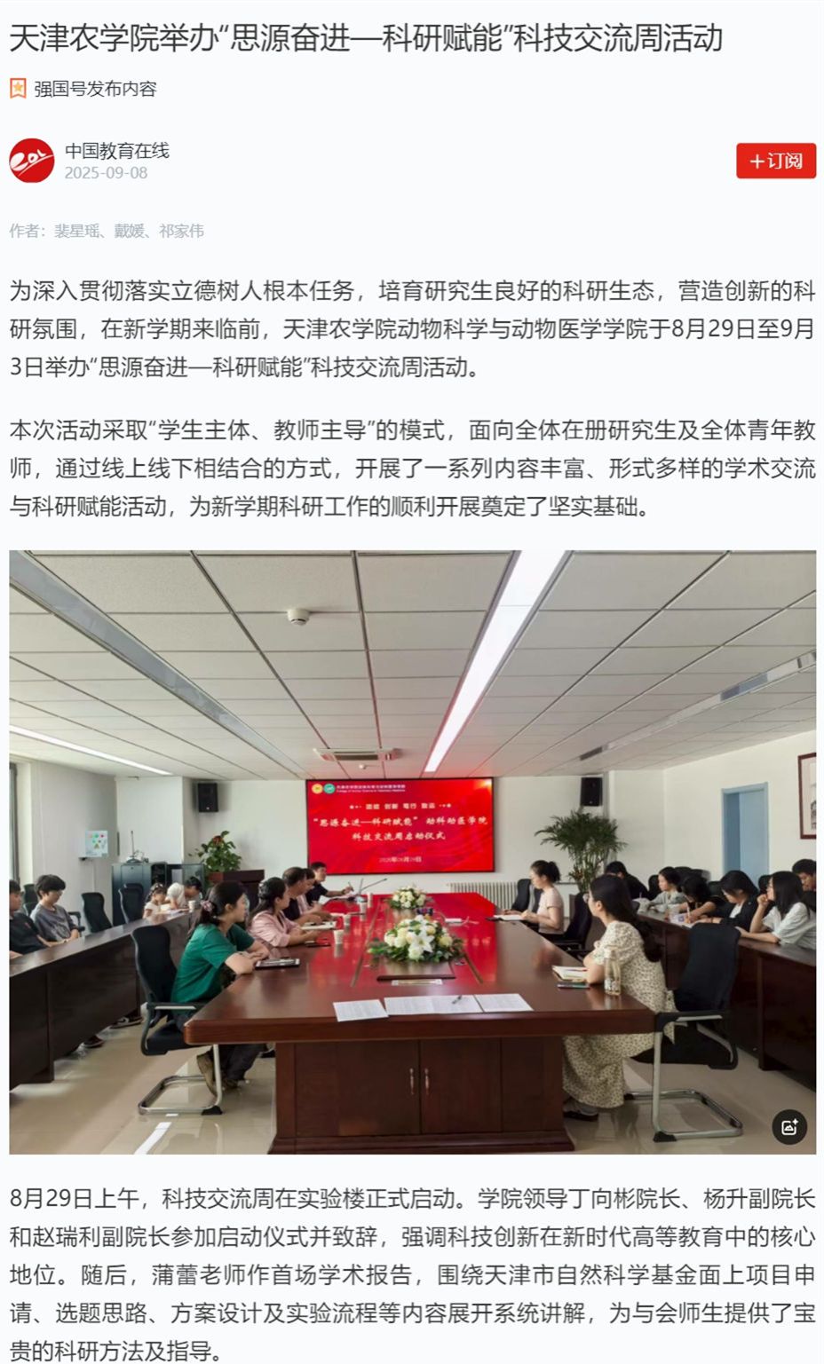 2025年9月8日,学习强国平台、中国教育在线网报道,365官网动物科学与动物医学学院举办“思源奋进—科研赋能”科技交流周活动。通过线上线下相结合的方式,开展了一系列内容丰富、形式多样的学术交流与科研赋能活动,为新学期科研工作的顺利开展奠定了坚实基础。