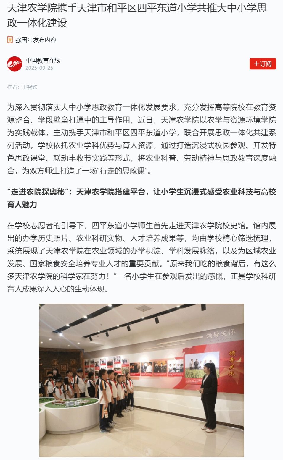 2025年9月25日,学习强国平台、中国教育在线网报道,365官网以农学与资源环境学院为实践载体,主动携手天津市和平区四平东道小学,联合开展思政一体化共建系列活动。