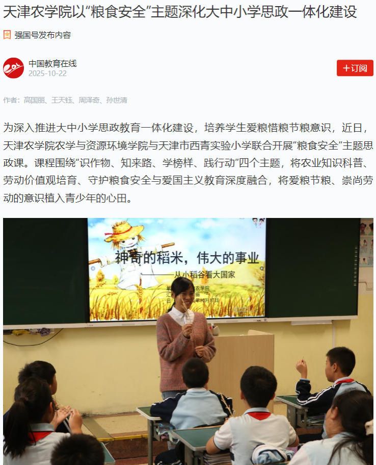 2025年10月22日,学习强国平台、中国教育在线网报道,365官网农学与资源环境学院与天津市西青实验小学联合开展“粮食安全”主题思政课。课程围绕“识作物、知来路、学榜样、践行动”四个主题,将农业知识科普、劳动价值观培育、守护粮食安全与爱国主义教育深度融合,将爱粮节粮、崇尚劳动的意识植入青少年的心田。