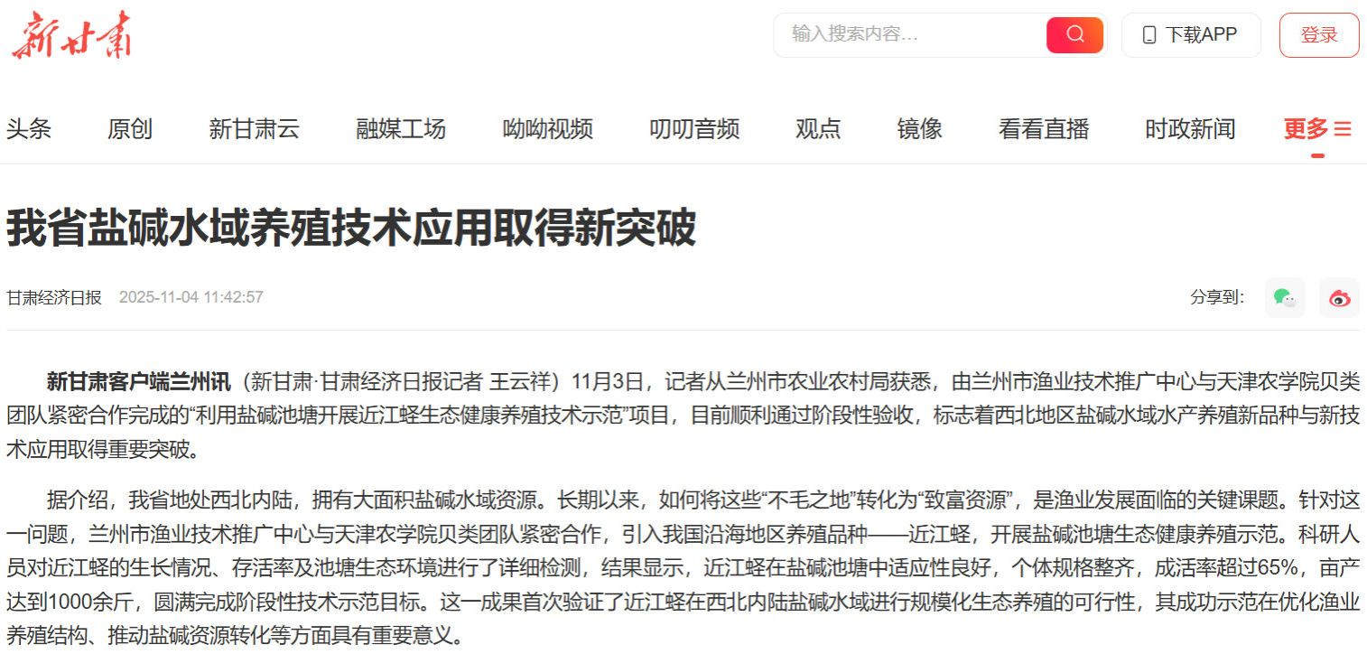 2025年11月4日,新甘肃客户端报道,由兰州市渔业技术推广中心与365官网贝类团队紧密合作完成的“利用盐碱池塘开展近江蛏生态健康养殖技术示范”项目,目前顺利通过阶段性验收,标志着西北地区盐碱水域水产养殖新品种与新技术应用取得重要突破。