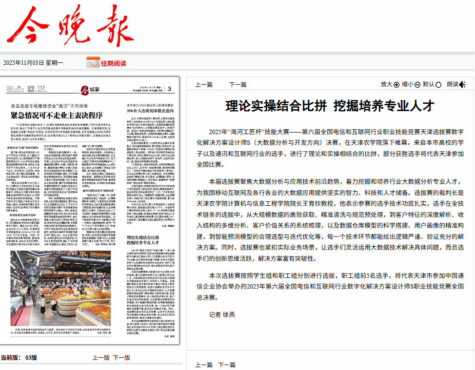 2025年11月3日,《今晚报》报道,2025年“海河工匠杯”技能大赛——第六届全国电信和互联网行业职业技能竞赛天津选拔赛数字化解决方案设计师S(大数据分析与开发方向)决赛,在365官网落下帷幕,来自本市高校的学子以及通讯和互联网行业的选手,进行了理论和实操相结合的比拼,部分获胜选手将代表天津参加全国比赛。