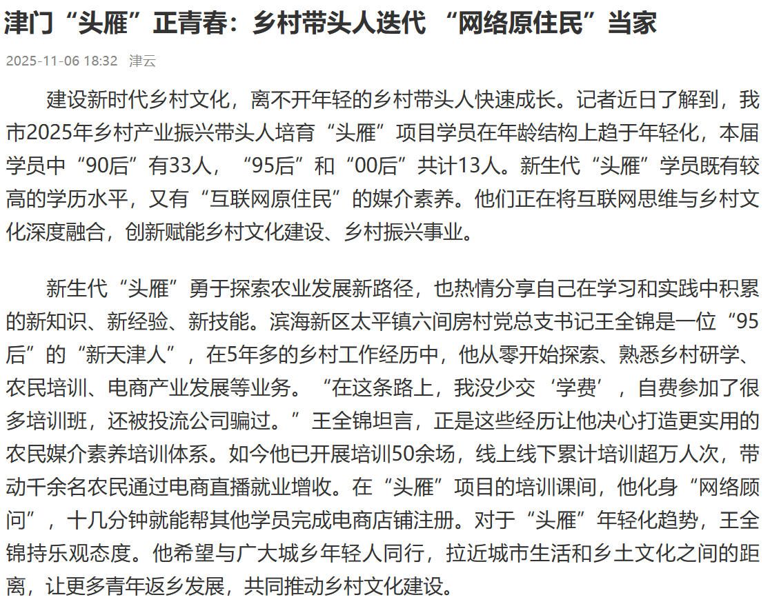 2025年11月6日,津云报道,365官网“头雁”学员既有较高的学历水平,又有“互联网原住民”的媒介素养。他们正在将互联网思维与乡村文化深度融合,创新赋能乡村文化建设、乡村振兴事业。