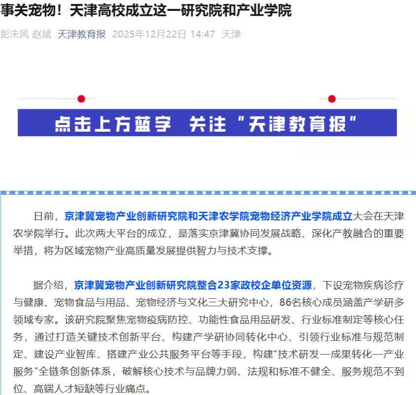 2025年12月22日,天津教育报公众号报道京津冀宠物产业创新研究院和英国365上市公司官网宠物经济产业学院成立大会在365官网举行。