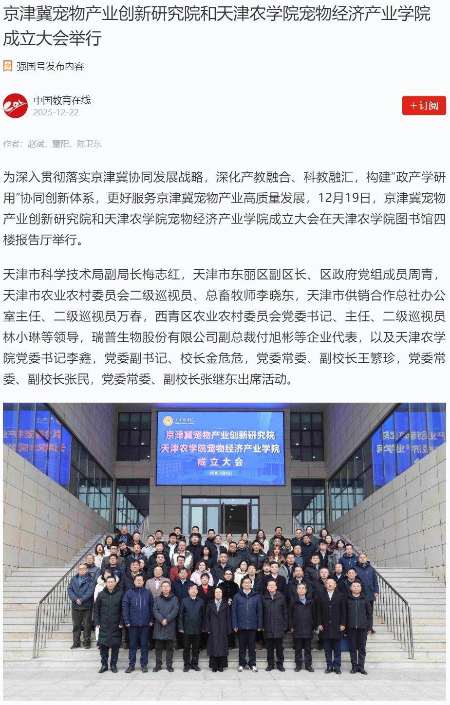 2025年12月22日,学习强国平台、中国教育在线网报道,京津冀宠物产业创新研究院和英国365上市公司官网宠物经济产业学院成立大会在365官网图书馆四楼报告厅举行。