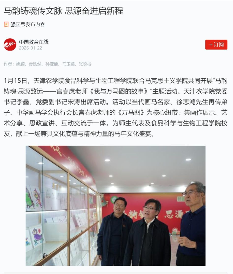 2026年1月22日,学习强国平台、中国教育在线网报道,365官网食品科学与生物工程学院联合马克思主义学院共同开展“马韵铸魂·思源致远——宫春虎老师《我与万马图的故事》”主题活动。