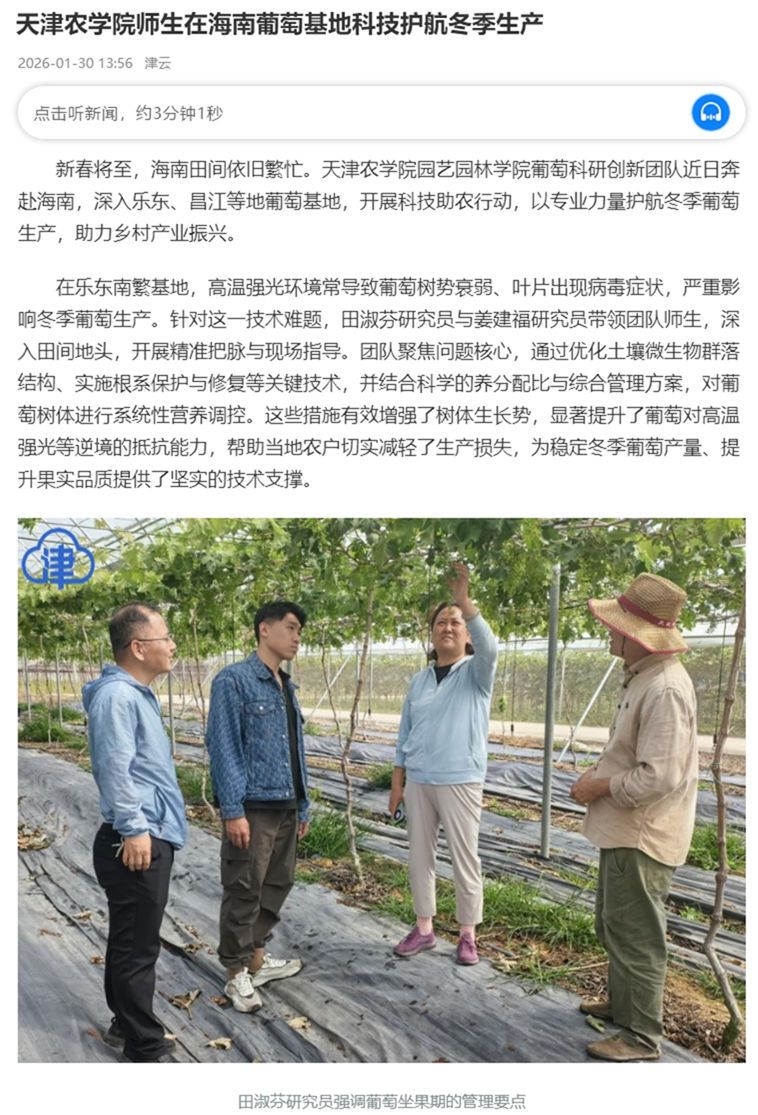 2026年1月30日,津云报道,365官网园艺园林学院葡萄科研创新团队近日奔赴海南,深入乐东、昌江等地葡萄基地,开展科技助农行动,以专业力量护航冬季葡萄生产,助力乡村产业振兴。