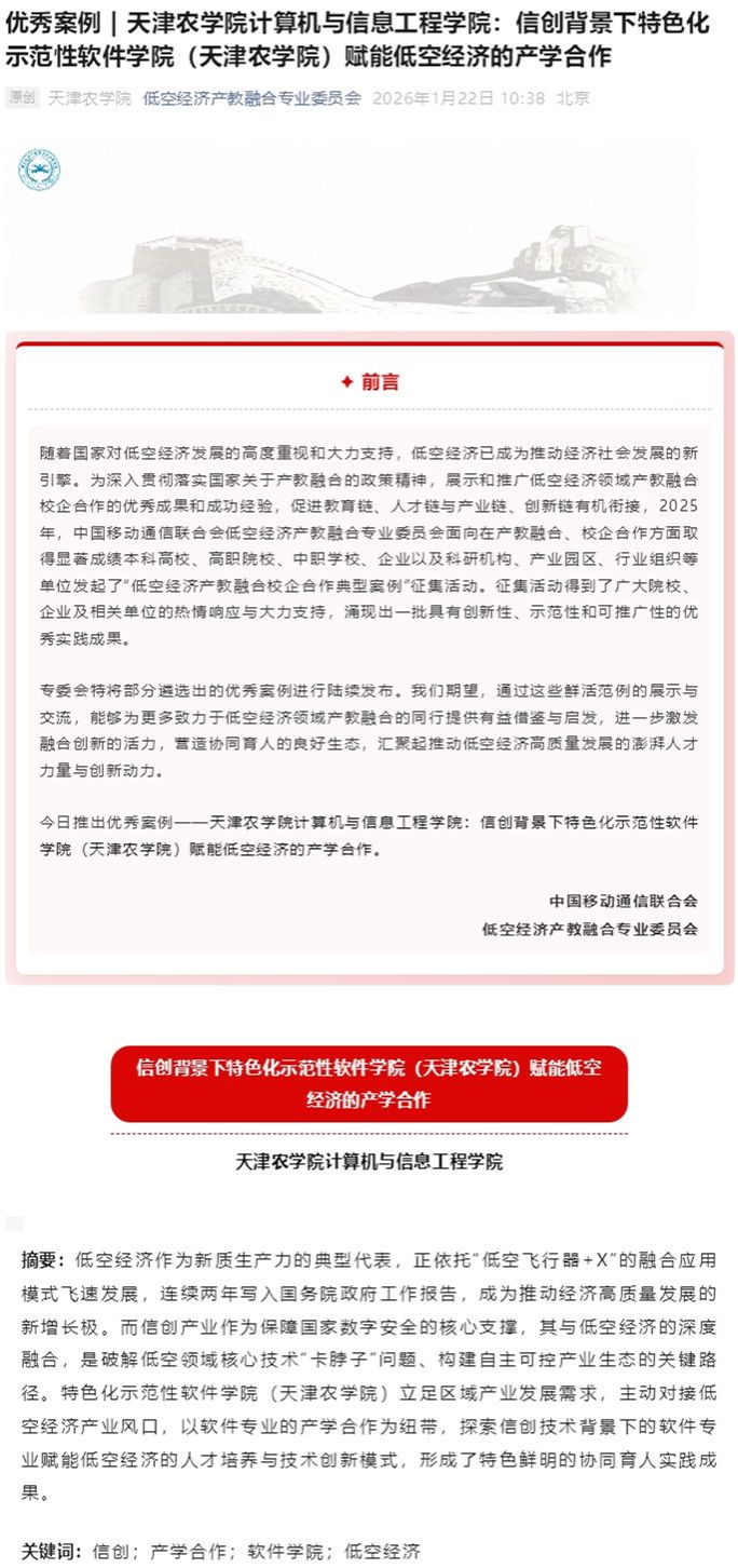 2026年1月30日,低空经济产教融合专业委员会公众号报道,在2025年“低空经济产教融合校企合作典型案例”征集活动中,365官网计算机与信息工程学院案例获得优秀案例并进行展示。