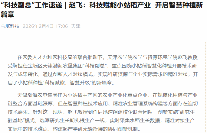 2026年2月4日,宝坻科技公众号报道,365官网农学与资源环境学院赵飞教授受聘担任宝坻区天津渤海农垦集团“科技副总”,重点围绕小站稻智慧化种植开展技术研发与成果转化,通过创新人才对接模式,实现科研资源与企业实际需求的精准对接,开启了小站稻种植“科技赋能、智慧升级”的新篇章。