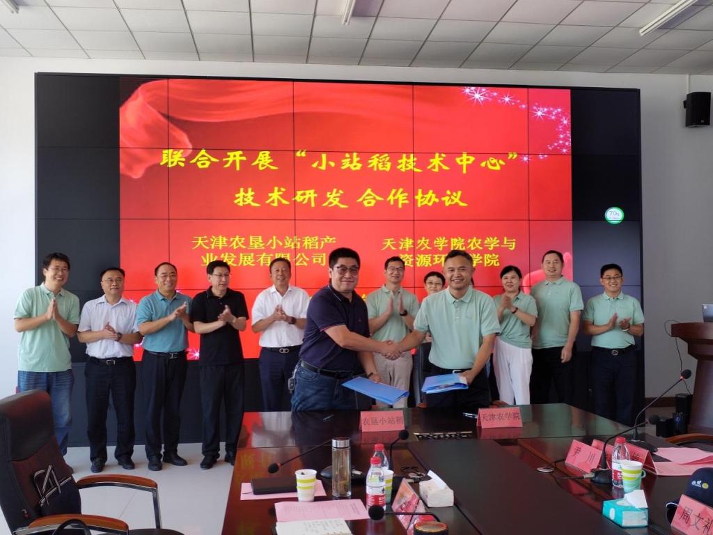 农学与资源环境学院院长谢晓东与天津农垦小站稻产业发展有限公司董事长饶志仓共同签署了“联合开展‘小站稻技术中心’技术研发”的合作协议。