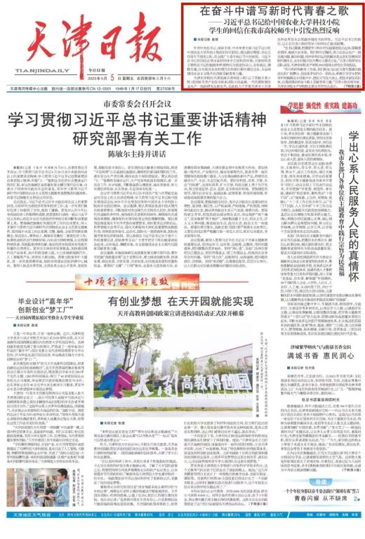 2023年05月05日,《天津日报》头版报道习近平总书记给中国农业大学科技小院学生的回信在我市高校师生中引发热烈反响》。全文如下: