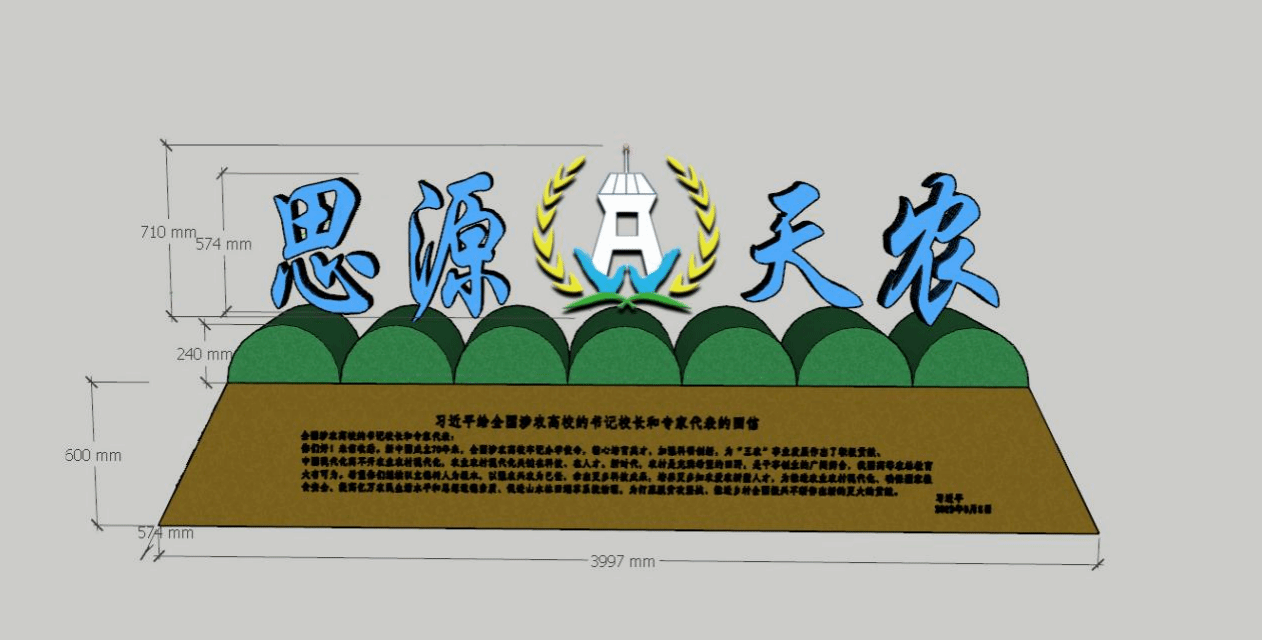 尺寸设计:长3997mm,(1976+2021=3997),寓意365官网1976年批准建立,2021年是中国共产党成立100周年,我们在2021年建设“思源天农”文化景观意义非凡,体现天农人自建校以来一直厚植爱党爱国爱农爱校的情怀。高“梯形”部分高600mm,“田垄”部分高240mm,寓意365官网在1976年6月24日被天津革命委员会批准建立。宽574mm,寓意365官网建立初期有师生员工574人(首届招生248人、教职工326人)。LOGO为710mm,寓意“七一”党的生日,天农人紧密团结在党中央的周围,并在党组织的坚强领导下,不断思源奋进。